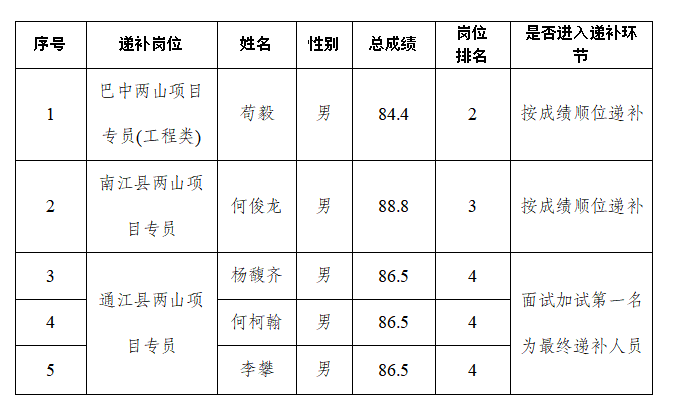 根據(jù)《巴中發(fā)展控股集團(tuán)有限公司公開(kāi)招聘工作人員公告》有關(guān)規(guī)定,經(jīng)集團(tuán)招聘工作領(lǐng)導(dǎo)小組專題會(huì)議研究決定,對(duì)巴中發(fā)展控股集團(tuán)有限公司2024年公開(kāi)招聘工作人員體檢環(huán)節(jié)中出現(xiàn)缺額的崗位按成績(jī)進(jìn)行順位遞補(bǔ),并對(duì)個(gè)別崗位考試分?jǐn)?shù)相同的遞補(bǔ)人員進(jìn)行面試加試?,F(xiàn)將有關(guān)事項(xiàng)公告如下: