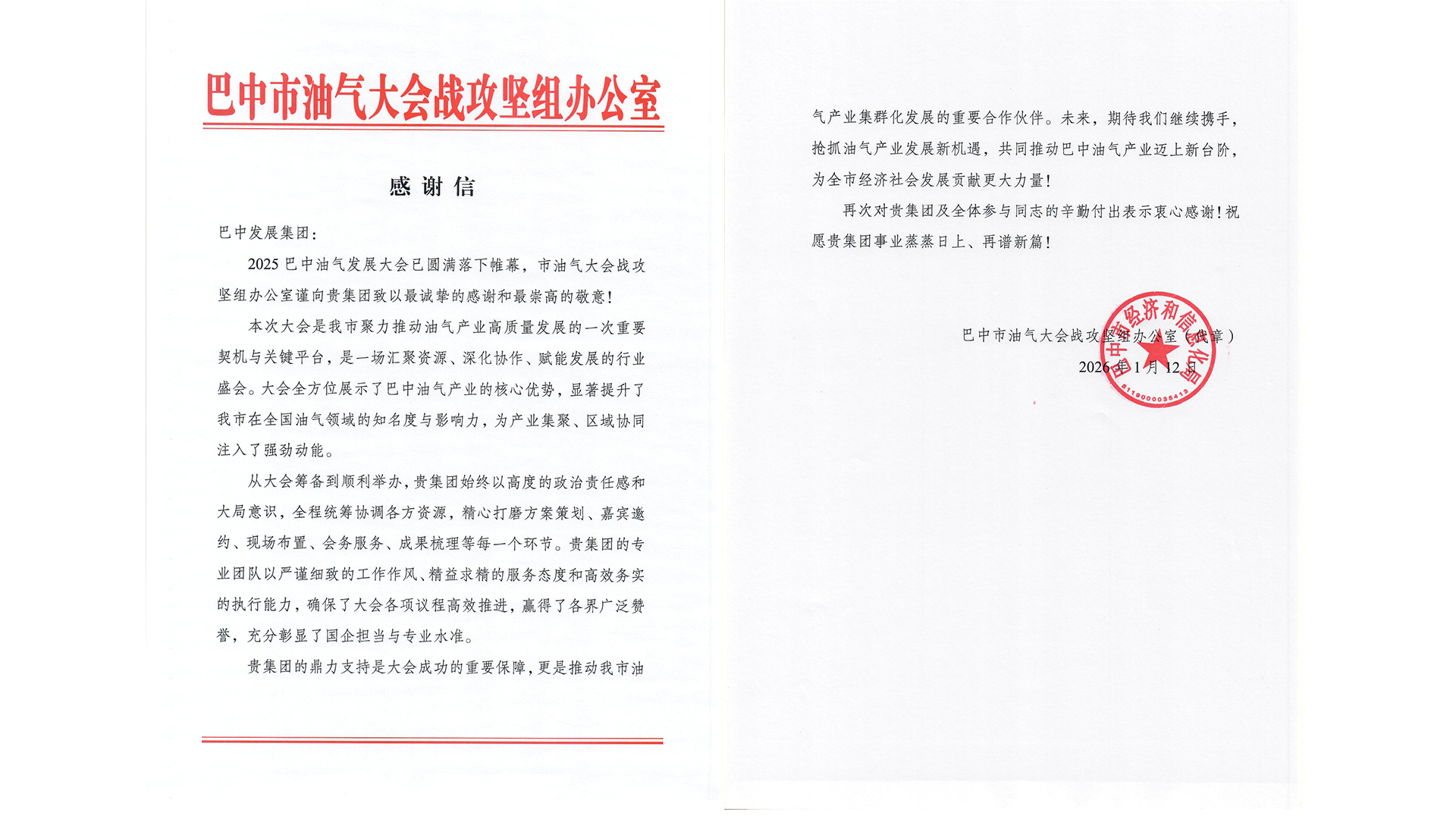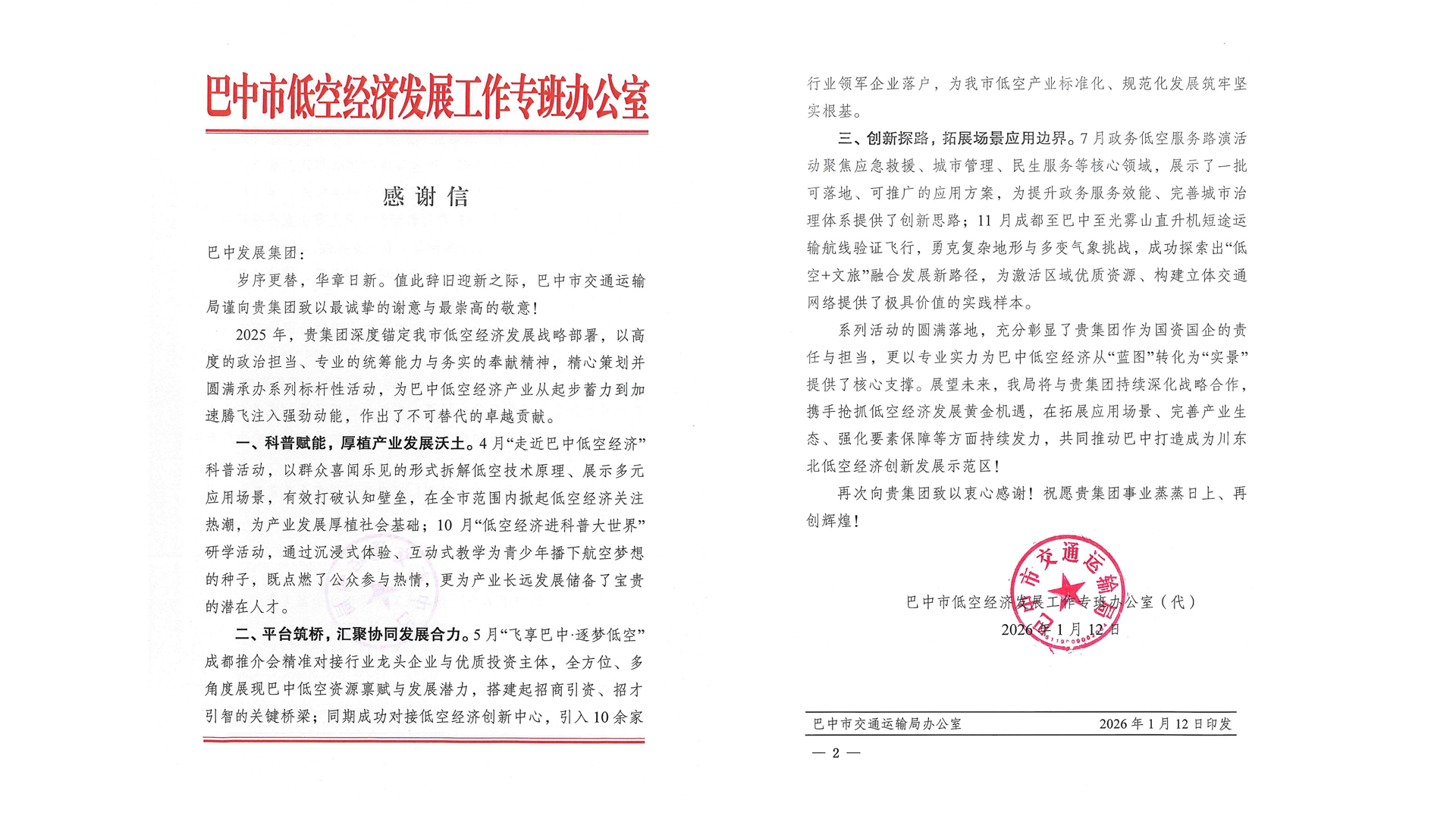 近日,巴中發(fā)展控股集團有限公司收到來自巴中市低空經(jīng)濟發(fā)展工作專班辦公室和巴中市油氣大會戰(zhàn)攻堅組辦公室的感謝信。信中對2025年巴中發(fā)展集團積極支持低空經(jīng)濟產(chǎn)業(yè)和推動油氣產(chǎn)業(yè)高質(zhì)量發(fā)展表示感謝。