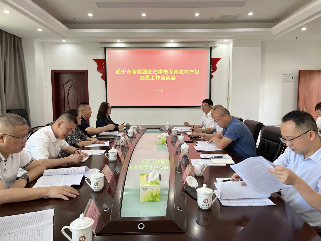 7月4日,由遂寧市政府副秘書(shū)長(zhǎng)劉旭帶隊(duì),遂寧市農(nóng)業(yè)農(nóng)村局副局長(zhǎng)劉罡霏、遂寧市財(cái)政局副局長(zhǎng)何國(guó)強(qiáng)、遂寧興業(yè)集團(tuán)黨委書(shū)記、董事長(zhǎng)向誠(chéng)、遂寧數(shù)字產(chǎn)業(yè)集團(tuán)黨委書(shū)記、董事長(zhǎng)唐清華、遂寧市金融工作局資本市場(chǎng)科科長(zhǎng)黎陳等一行人員蒞臨巴中發(fā)展控股集團(tuán)有限公司考察農(nóng)村產(chǎn)權(quán)交易工作并召開(kāi)座談會(huì),巴中市政府副秘書(shū)長(zhǎng)何潔明主持會(huì)議,巴中市農(nóng)業(yè)農(nóng)村局副局長(zhǎng)馮金光、農(nóng)村改革科科長(zhǎng)楊忠平、巴中發(fā)展控股集團(tuán)黨委委員、副總經(jīng)理劉仕勇、成都農(nóng)交所巴中分公司總經(jīng)理、巴中市鑫匯農(nóng)業(yè)服務(wù)有限公司執(zhí)行董事羅曉東參加會(huì)議。