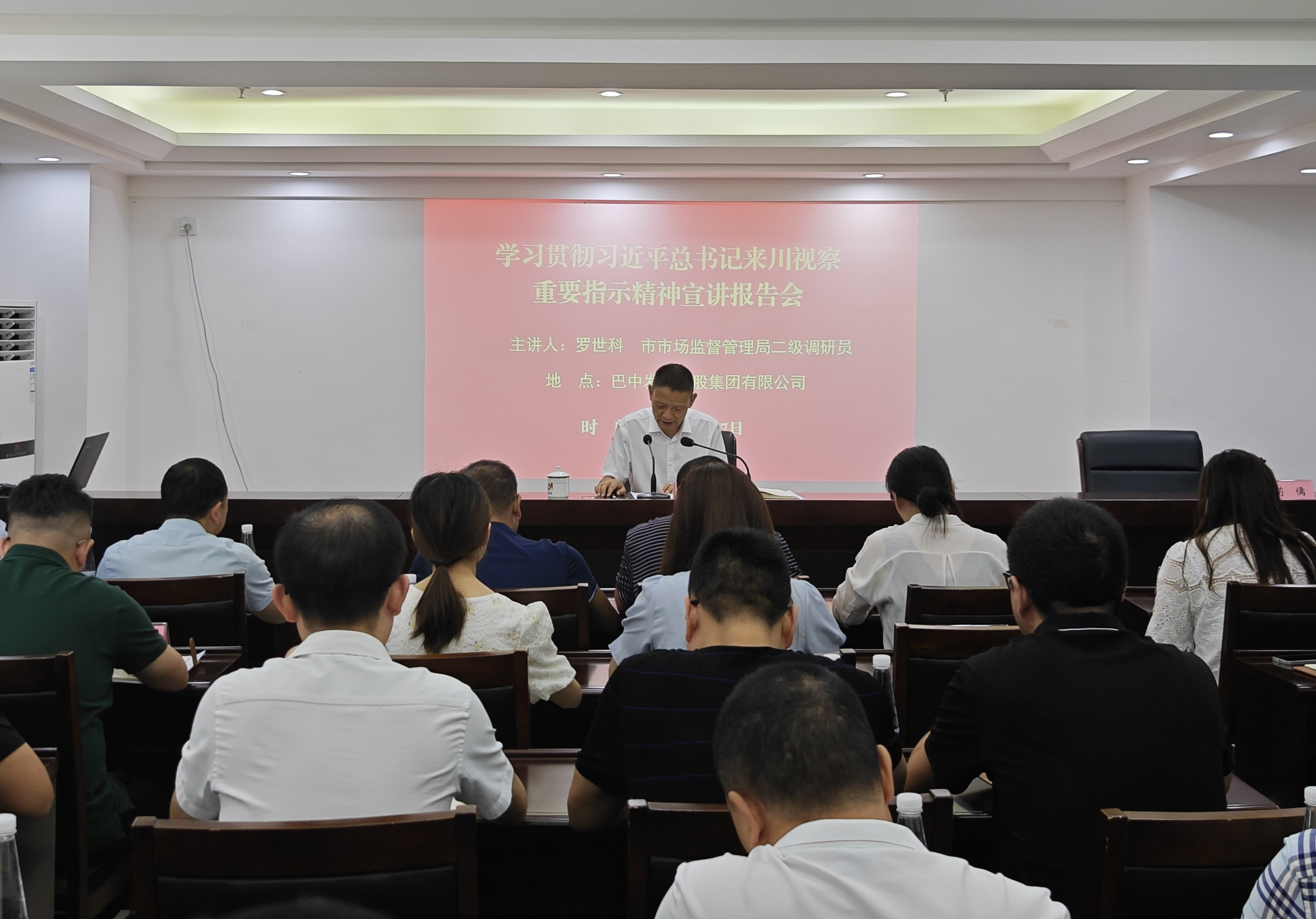 9月7日,為深入學(xué)習(xí)宣傳貫徹習(xí)近平總書記來川視察重要指示精神,市委宣講團(tuán)企業(yè)宣講分隊在巴中發(fā)展控股集團(tuán)有限公司開展專題宣講活動。市市場監(jiān)督局二級調(diào)研員羅世科做專題宣講報告,集團(tuán)公司中層管理人員,下屬二、三級企業(yè)領(lǐng)導(dǎo)班子成員等參加會議。